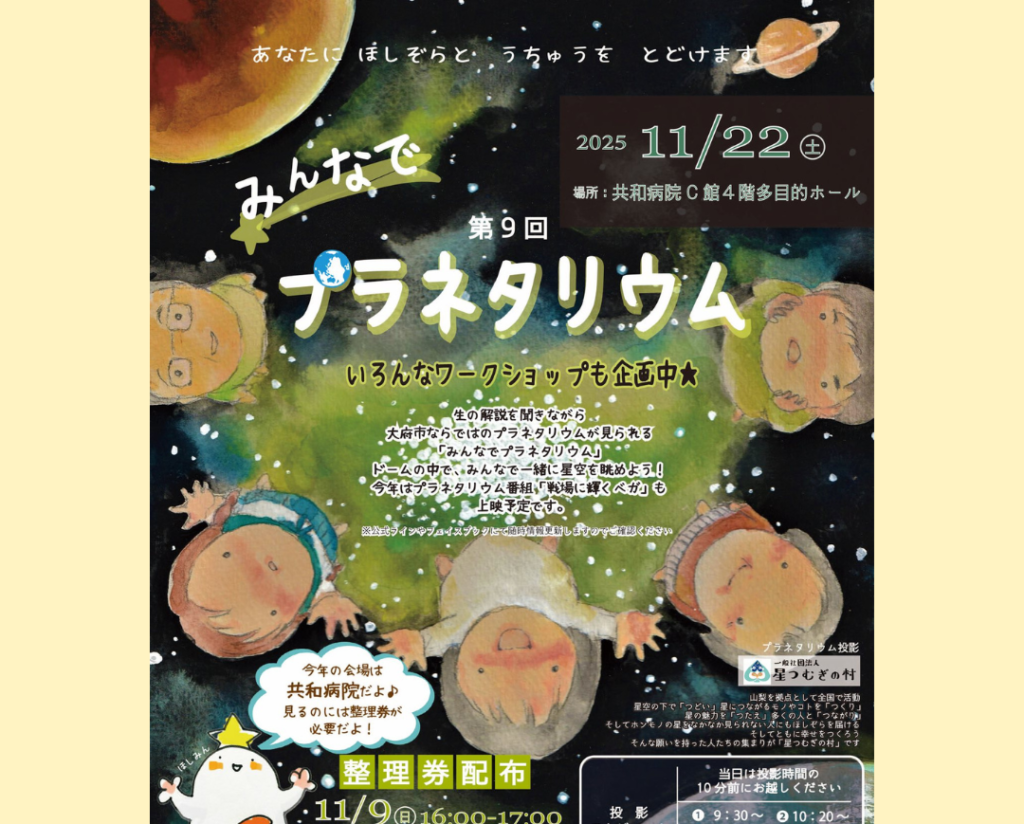 第9回おおぶみんなでプラネタリウム 日時:11月22日(土) 場所:共和病院C館4階 多目的ホール(〒474-0071愛知県大府市梶田町2丁目123) 7mドーム 投影スケジュール(プラネタリウム各回定員35名) ①9:…