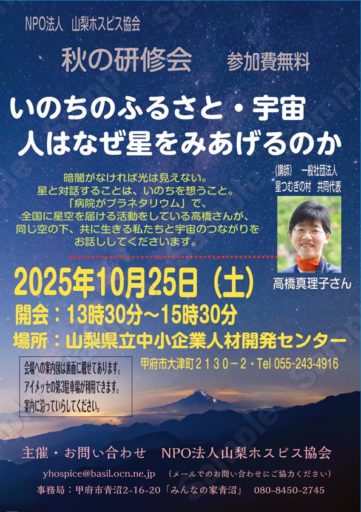 10月25日(土)NPO法人 山梨ホスピス協会主催 いのちのふるさと・宇宙 ー人はなぜ星を見上げるのか