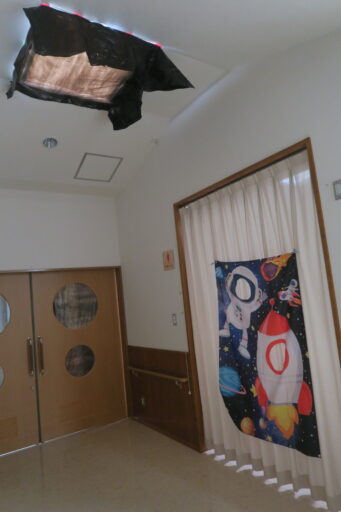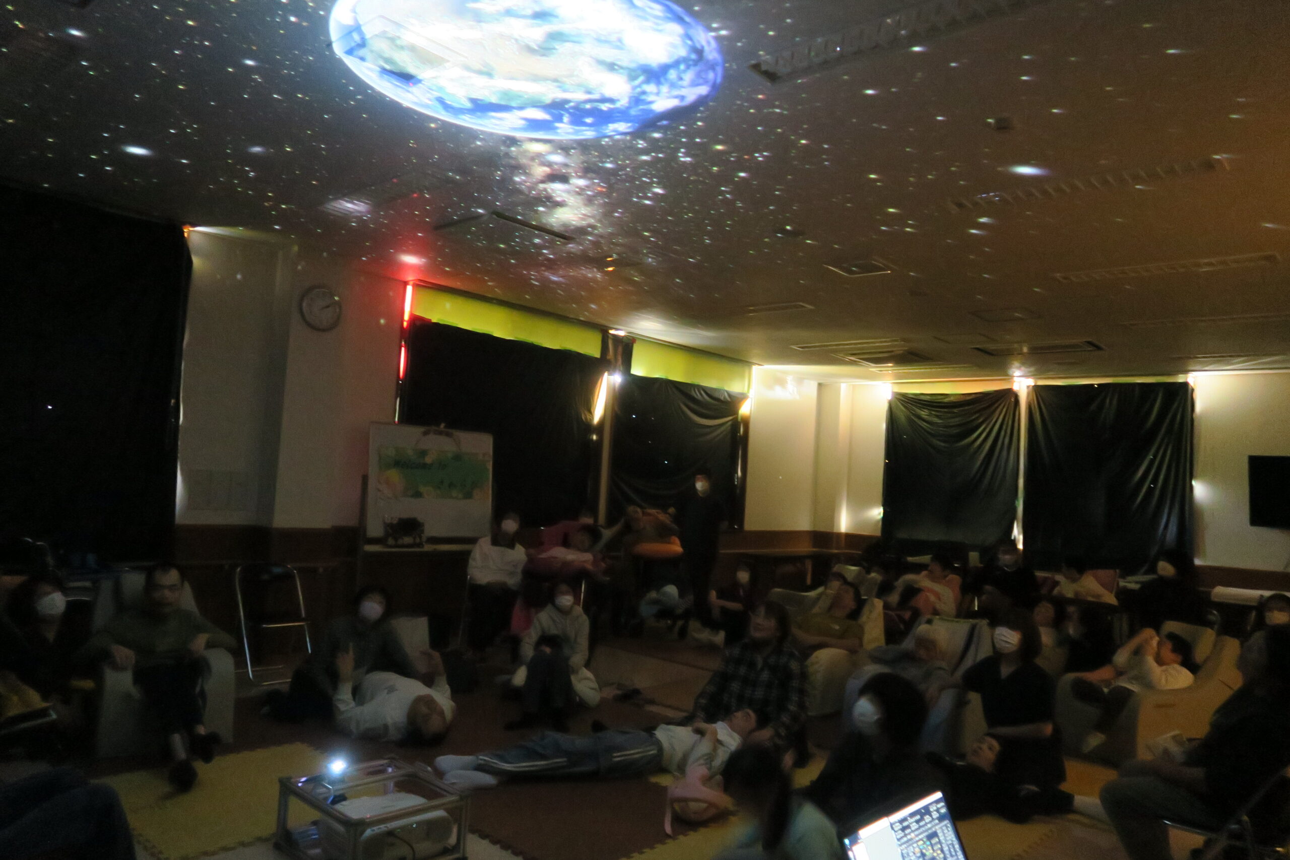 22組のみなさんが部屋いっぱいに寝転がったり、座椅子に座ったりして、いろんな気持ちを出してくださるみなさんの声も投影とあいまって、幸福感いっぱいな時間。終了後、顔だし宇宙飛行士記念撮影も大好評でした。