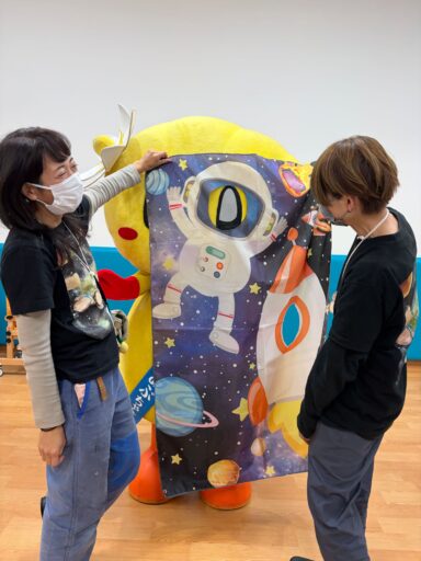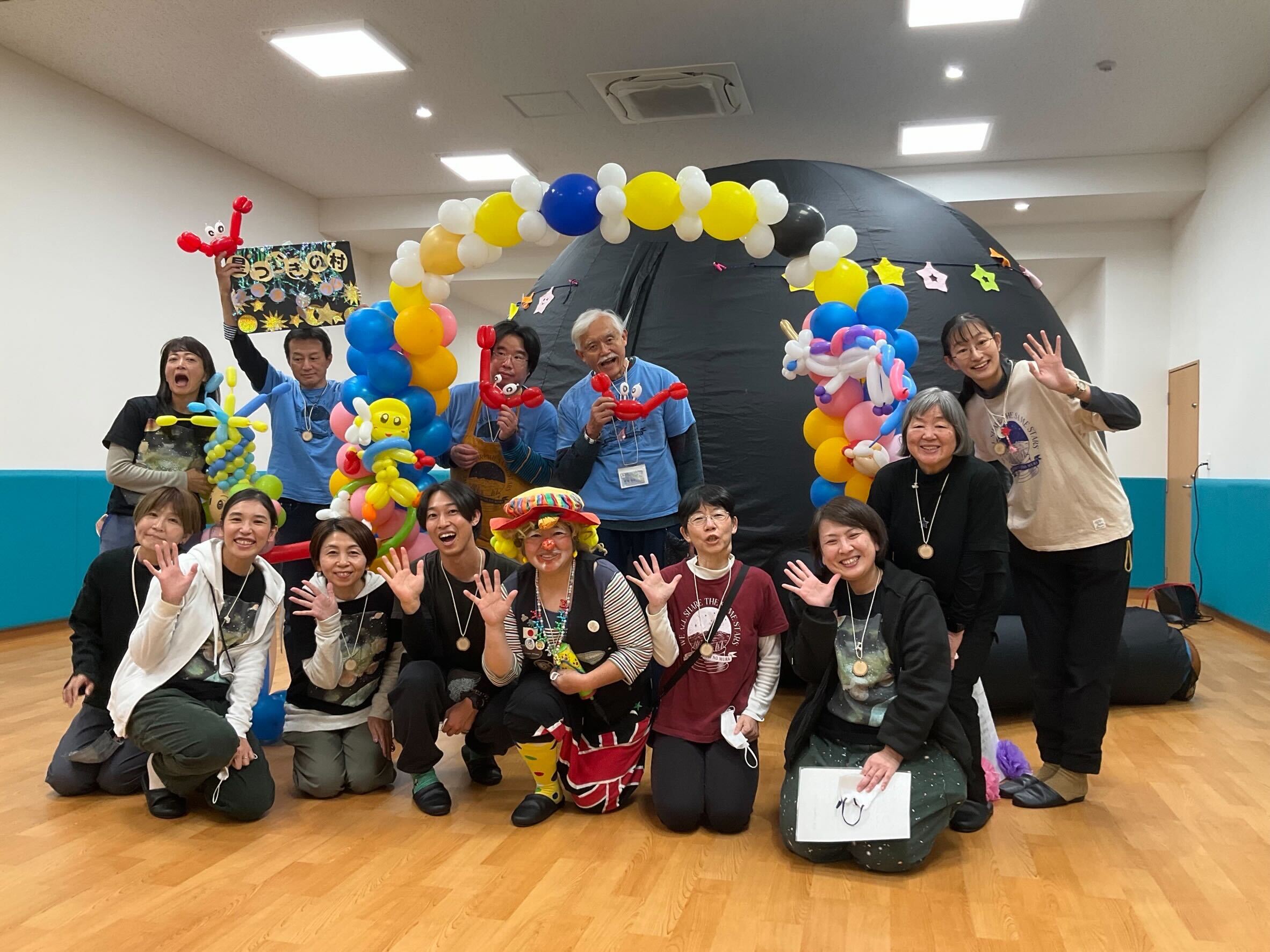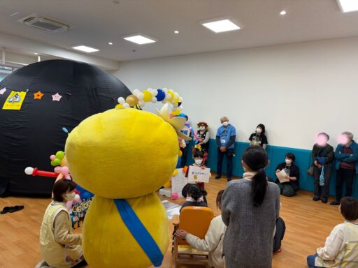 11月21日(金)第9回おおぶみんなでプラネタリウムの一環、かつTOOTHFAIRYチャレンジキッズプロジェクトの一環として、大府市発達支援センターみのりにて、みのりと近隣のなないろ利用者さんときょうだいさん、ご家族対象に、4mドームにて2回投影。星つむぎの村からは、真理子さん、りょっぴぃ、にっち、優子さん、チョクさん、やまちゃん、りゅうさん、すばる星人さん、あきこ、おおぶみんぷらからきんちゃん、まいこちゃん、ゆきちゃん、けいこちゃんスペシャルゲスト おぶちゃん投影はどちらも優子さん1回目 子ども3人、大人9人 2回目 子ども6人、大人8人愛知でもインフルエンザが猛威をふるい、5家族が参加できずでした。ドームの外からの感想です。1回目の投影では、「泣く」ということで表現をしているお子さんが多かったです。初めてみるプラネタリウムの世界に、驚きや不安などの感情もあったのかもしれません。これも体験のひとつで、これからもいろいろな体験ができたらいいと思うと施設のスタッフさんがおっしゃっていました。2回目の投影は、歓声で表現をされていました。「きれ〜」「わぁ〜」「うぉ〜っっ」ドームの外からも、今このシーンなんだなと景色を想像しながら楽しめました。大府ではおぶちゃんがこどもたちに大人気!!抱きついたり、写真を撮ったり、大好きが伝わってきました。そして、大府といえばチョクさん!!プラネタリウム前に、犬のおまわりさんや森のクマさんを歌いながら、バルーンをつくってくれました。みんなが笑顔になって和らいできたところでプラネタリウムが始まる流れがすごく良かったです。お揃いのTシャツを着たかに座の御三方、チョクさんからカニバルーンとともに
