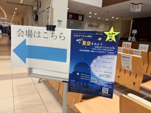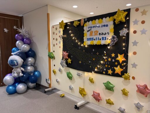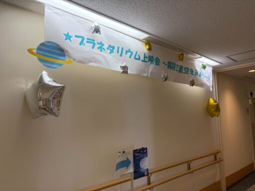 11/23(日)岐阜市民病院にて7mドームでのプラネタリウムと、スクリーンでのプラネタリウムを実施しました。岐阜市民病院、岐阜病院、黒野病院の認知症疾患医療センター連携でプラネタリウムをよんでいただきました。星つむぎの村からは、真理子さん、りょっぴぃ、すばる星人さん、あきこ。レポートはあきこです。午前中は7mドーム2回、午後からはスクリーン投影2回。暗さや圧迫感が苦手な方にも見てもらえるようにということで、午後からはスクリーンでの投影です。認知症の患者さんやご家族のみでなく、どなたでもお越しいただける回でした。プラネタリウム後は、認知症相談窓口やパネル展示があったり、当事者同士の交流の居場所作りもなされていました。1回目 18名スタッフさん6名 投影:真理子さん2回目 19名スタッフさん6名 投影:りょっぴぃ3回目 13名スタッフさん3名 投影:真理子さん4回目 14名スタッフさん6名 投影:真理子さん玄関から会場までわかりやすく案内があり、わくわくするような会場の飾り付けでした。終了後はクリスマスツリーに感想をメモ書きできるコーナーも。感想の一部です。「見上げれば 我がふるさとや 冬銀河」「一人一人が美しい星 みんなで地球をつくっている」「とってもきれいでした。同じ星の下、みんなそれぞれがんばってますね」この日スタッフさんは手首に光るリングをしていました。午後からの投影で部屋全体が暗くなるので、何かあった時にはリングをしている人に声をかけてくださいという目印のためにつけておられたのだそうです。飾り付けにしてもこういう対応にしても、あたたかさがそっとそばにあるような、優しさを感じる時間でした。プラネタリウムが始まる前に「早く始めてよ!」と何度もおっしゃっていた方。ドームに入ってから「どこに星を上げておるの!!」の発言に、りょっぴぃが「もうすぐでますからね〜」と返したやりとりが場の笑いを誘い、和やかな雰囲気で進んだようです。満天の星カウントダウンの途中で、きっと目を開けていらっしゃったんだろうなと思われる発言もありましたが。ドームから出た後に、「ありがとうね」と言って帰られました。プラネタリウムを楽しみにしてくれていたのかなと感じて、私も嬉しい気持ちになれました。