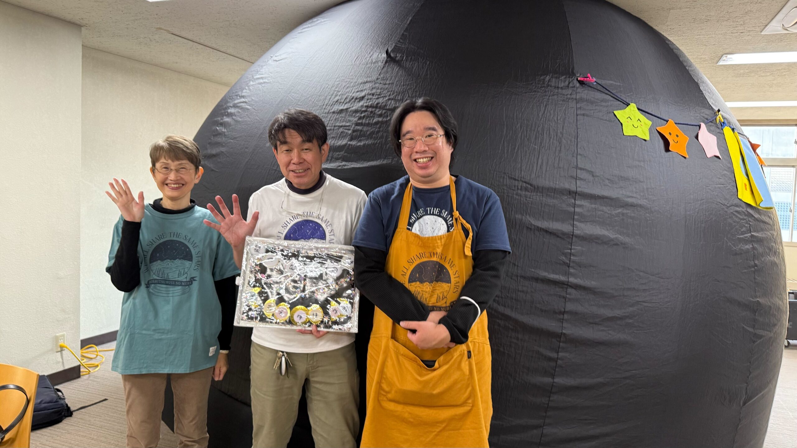 TOOTHFAIRYチャレンジキッズプロジェクトの一環です。星つむぎの村からは、跡部さん、りょっぴぃ、金盛さんの3人です。レポートはりょっぴぃ。本当に盛りだくさんの医療や福祉に関する文化祭みたいな感じで、OriHimeに関する講演から、ポニーちゃんの乗馬体験、地域の新鮮野菜が買えたり、移動図書館が来てたり、プラネタリウムの隣では天文の講演があったり…金盛さんは、”おくりびと体験”でお棺に入って写真を撮ってもう、なんてこともしてました。4mドームでの全5回投影。担当はりょっぴぃ。1回目のみ少ない人数でしたが、あとの回は満員以上の人数に入っていただきました。子ども連れのファミリーや、出展者や福祉施設関係の方、大学生のスタッフなど、幅広い人たちにご覧いただきました。出張プラネタリウムの詳細について色々きいてくれる方もいらして、ここからまた新たな依頼につながる機会になるかもしれません。今日の投影は、子どもたちの声をもれなく拾って行えたように思います。小さい子の「流れ星見れるのかな…?」「オーロラ見えるのかな…?」という、小さなささやきに即座に反応し、その場でユニビューのコマンドを書き換え流れ星を流したり、オーロラの映像をみながら低緯度オーロラで日本からも見えたんですよと話をしたり臨機応変に投影をカスタマイズ。喜んでもらえました。大人や学生からの感想は、綺麗だった、お話が面白かった、また、ひとりの学生さんからは「映画ドラえもん」を見終わったような感じ、という感想をいただきました。ちょっとサイエンスティックに冒険してきた感じ?ということかなぁ。