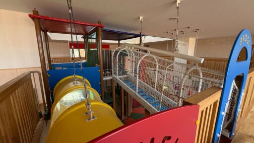 お昼休みには施設の中を、いろいろ案内してもらいました。新しい設備が揃っていて、お部屋も校庭もとても広く、遊ぶところも、過ごすところもたくさんあって…なかでも玄関入って目の前の吹き抜けにそびえ立つ、ツリーハウスのアスレチックは圧巻でした!