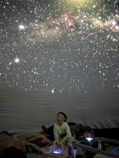 星つむぎの村からは、高橋、優子さんの2名で。4mドームです。今回は、1回につき1組ずつの贅沢な時間となりました。みんな医ケア児さんのご家族です。前回見たよ、というご家族には、南半球の星空やお誕生日の星空。 はじめてですよーというご家族は、これからいろいろお出かけチャレンジしたいというところだそうで、北杜市にも以前は何度も来たことがあるとのことで、今回きっかけに、星つむぐ家まで来てくれたらうれしいな、というご家族。 3組目は、前回見たとき、お兄ちゃんは怖い、といって外に遊びにいっちゃったんだけど、すごくよかったよ、とお母さんが声をかけてくれて、その前にも予定があったけどがんばってきました!というご家族。5歳のおにいちゃん、恥ずかしがりやさんで、足がすくむ感じも最初はあったけど、夢中になって楽しんでました。