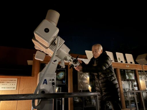 実は、会場の「川崎市八ヶ岳少年自然の家」は、星つむぎの村の前身である「星の語り部」時代の毎年の合宿場所でした。アストロハウスという素晴らしい天体観測場所があります。床暖房つき、クーデ式望遠鏡4台。100人の子どもたちが短い時間で一度に観望できるように考えられた施設で、若宮崇令先生という、川崎のプラネタリウムに長くいらして、JPAの前身のJPSの会長もやられた方が、アストロハウスをつくられたのでした。若宮先生、80歳を超え、脳梗塞も経験された体ですが、ご自身で運転し、2晩とも参加してくださいました。