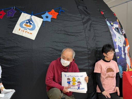 1回目13人(こども6人)、スタッフさん3人2回目こども9人、スタッフさん9人紙芝居 まさじい。恒例となりました顔はめは、ほぼ全員が写真撮影をし、ベストショット目指してスタッフさんも盛り上がってくださいました。満天の星、星座絵がうつると「わあーっ」と歓声とともに拍手をしたり、星座に手を伸ばして表現してくれるお子さんの姿もみられました。お誕生日星座では、その星座のお子さんを盛り上げるような声かけも。火星の場面はもれなく大盛り上がり。大人もしっかり声を出して、場が盛り上がっていました。会場にお越しいただいた保護者から「静かにしてないといけないと思うと、なかなか行けない」という声を複数いただきました。