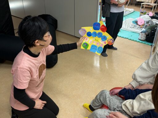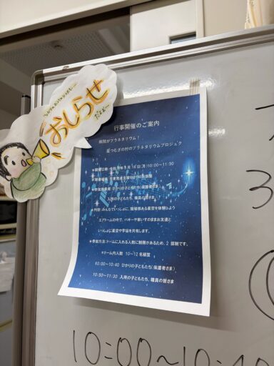 まさじいの紙芝居の中で「星つむぎの村は声を出していいプラネタリウムなので、みんなどんどん感じたことを声に出してくださいね。体調が悪かったら、ドームから出ていただいて構いませんが、こどもが泣いて申し訳ないからって、それで出なくても大丈夫ですよ。」「それと、途中で出たくなったらそれも出入り自由なプラネタリウムなので遠慮なく声をかけてくださいね。」とお話されていて、その言葉に肩の荷がおりるような安心を感じる方もいらっしゃったのではと思いました。まさじいの紙芝居、サクサクテンポよくお話していて、聞きやすかったです。真理子さんが準備でドームに入る時に「宇宙飛行士がエンジンかけてき〜す!」と言っていて、場のわくわくが倍増していました。ドーム前のこの紙芝居、大切な役割を担っていて、全国各地の村人が挑戦しています。投影終わりに、こどもたちやご家族みなさんで作られたとってもかわいいメッセージカードもいただきました。スタッフさんもこの日を楽しみにリーフレットや飾りを作ってくださいました。舞鶴こども療育センタースタッフのみなさま、お越しいただいたみなさま、ありがとうございました。