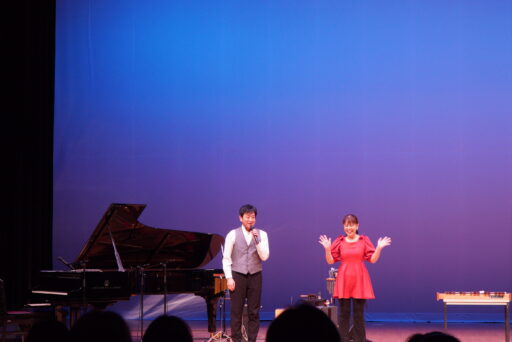 第一部、真人さん、晶子さんの生演奏から始まり、会場の350人超えのお客さまを音楽の世界へと導きました。子どもたちは照明を落とした広いホール内でも怖がらず、楽しそうに手拍子を打ったり、大きな声で返事したり、笑い声が聞こえリラックスした様子でした。