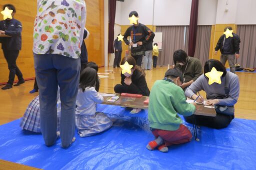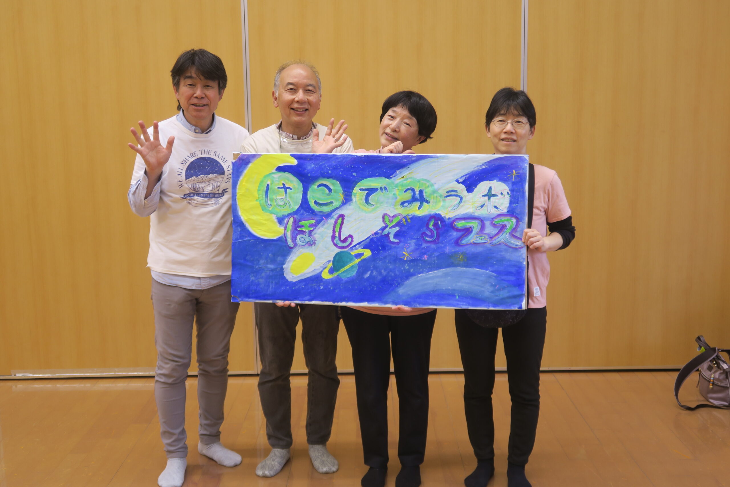 村からは、真理子さん、跡部さん、新しく村人に加わって 駆けつけてくれた領木さん、そして仲道×2。 たのしんでくれたのは、はこでみさんに通う子どもたち43名と保護者の方々+職員さんで25名、合計68名。 プラネ、午前2回、午後1回。奥の部屋では、星座カード、火星つりぼり、流れ星ロケット、星ぬり絵のワークショップ。