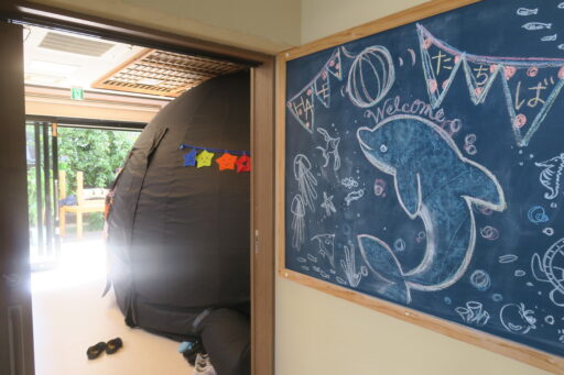 今回は、HALEに通う子どもたちと、近くの同じく重症児デイのPeaceさんにも声をかけてくださり、4mを3回投影しました。1回目は4組、2回目は7組、3回目は2組。寝そうなお子さんも、かっと目を見開き、暗くて無理かなーと言われてたお子さんも声をあげて夢中に見入って、みんな瞳いっぱいに星をうつして素敵な表情でした。