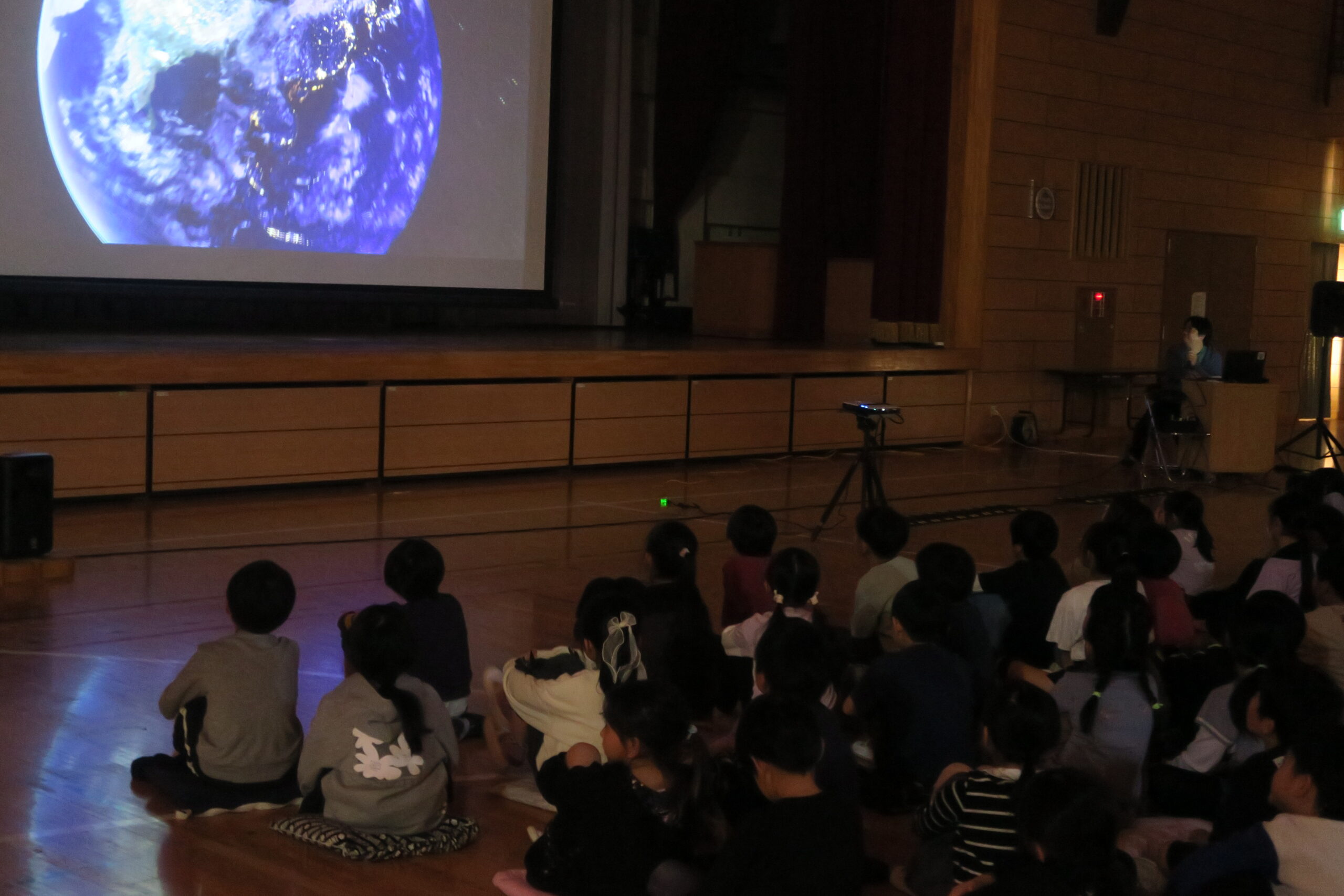 3月24日(火) 山城小学校 スクリーンプラネ甲府市の山城小学校の2年生200人に向けてスクリーンでのプラネタリウム投影に行ってまいりました。星つむぎの村からは跡部さん、宙先案内はりょっぴぃ。レポートは、りょっぴぃです。